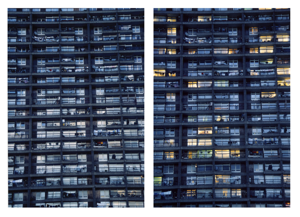この作品は、人間の存在そのものを写さずに、その痕跡を写しとる。巨大な集合住宅の、10分間の時間の経過を記録した2枚のフィルム。人間の営みをささやかに、ドラスティックに語る。
