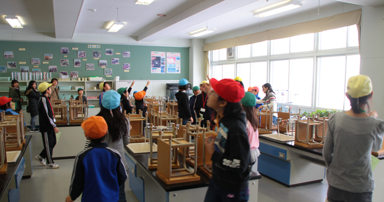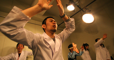 プロジェクトの最後には、ラボでの展示と、エントランスでのウェルカム映像インスタレーションを展示。「MAKAMAKA NIGHT」と題して、放課後の体育館で総まとめ的な映像作品公開し、先生が演劇を上演、それと繋がる形でオリジナルで制作した「マカマカたいそう」を組み込んだダンスパーティーを開催。学校側主催の「子どもチャレンジ」では、理科室と音楽室に、「まちがいさがし」的なインスタレーションを展開。学校行事と連携したゲーム性を持ったアートツアーを企画した。
