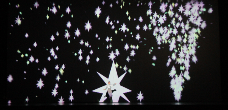 映像とダンスをシンクロさせた楽しい舞台を紹介します。古典からコンテまで多様なステージのオープニングを飾る楽しい作品です。最初にお話をした時に感じたのは、コンテンポラリーやクラシックバレエという枠を飛び越えようというようなエネルギーを感じる拓一郎さんの振り付けとアイデアでした。モニターで見ている仮想空間の平面的イメージ。ある種のエンターテインに徹しようと考えました。音と動きに正直に、デジタル上で見られるRGBによるビビッドカラーを使用しています。また後ほどこのページで映像を公開しようと思います。
