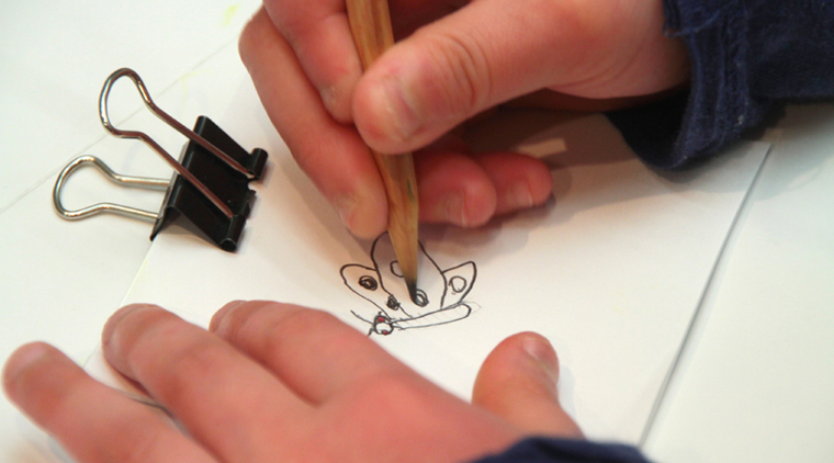 蝶が羽ばたく6フレームループの線画をプリントアウトして用意します。簡単に言えば塗り絵のようなものですが、互いの絵の前後関係を把握しながら進めるように指示します。例えば、誰かが画面に魚を書き加えれば、その前後を他の人もつながるように書き加えることになります。同時に、アニメーションとして考えた時に、「全てが同じ絵や色だと変化に乏しく退屈だ」と変化を促します。自身のアイデアと、他人のアイデアがコンフリクトする状況で、お互いにコミュニケーションを取りながら、一つの時間の流れを作りだす恊働制作を体験します。ここで保護者の役割は大きく、多くは子どもと子どもの間に緩衝材になる1フレームを描いているのが印象的でした。