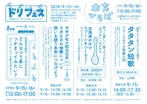 大通の歩行者天国で開催の札幌オオドオリ大学のアウトリーチイベント「ドリフェス」でコンセプトビジュアル、市電プロジェクトの路面電車100周年事業「どんなつり革につかまってみたい?」のコーディネートを担当